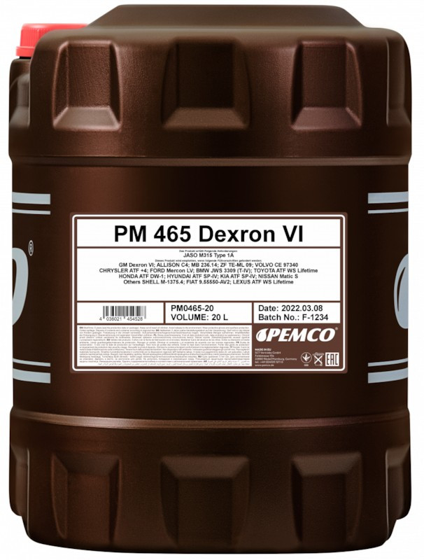 JASO M315 Type 1A, ALLISON C4, GM Dexron VI, FORD Mercon LV, CHRYSLER ATF +4, MB 236.14, ZF TE-ML 09, BMW JWS 3309 (T-IV), VOLVO CE 97340, NISSAN Matic S, HONDA ATF DW-1, HYUNDAI ATF SP-IV, KIA ATF SP-IV, TOYOTA ATF WS Lifetime, LEXUS ATF WS Lifetime, FIAT 9.55550-AV2, Others SHELL M-1375.4
